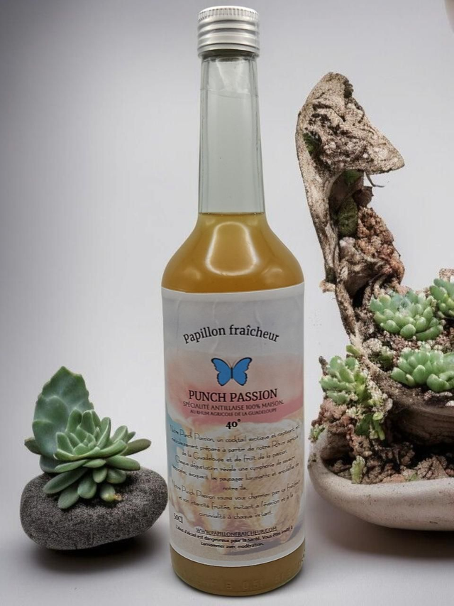 Notre Punch Passion, un cocktail exotique et captivant, est méticuleusement préparé à partir de notre Rhum agricole de la Guadeloupe et de fruit de la passion.